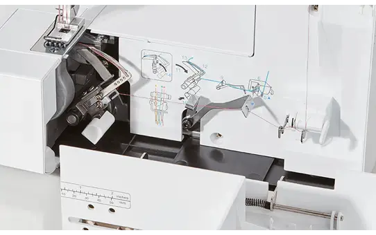 Follow a single coloured line per thread spool as a guide for easy threading, even with 5 spools on the CV3550.